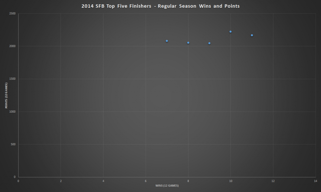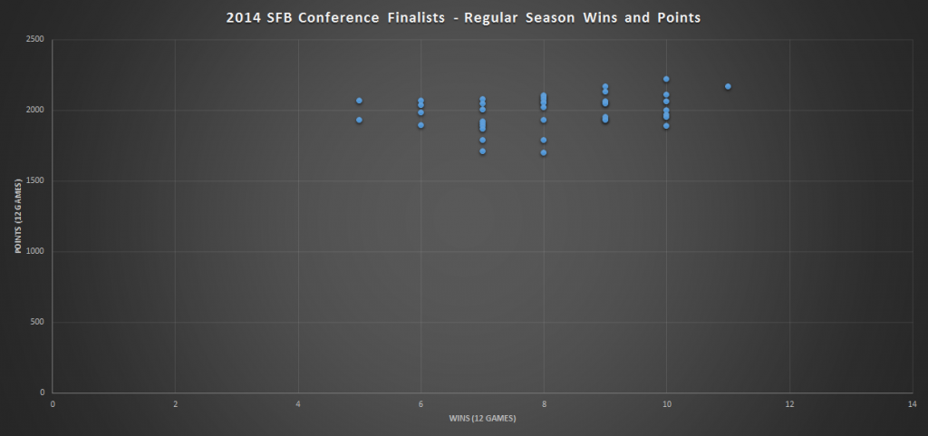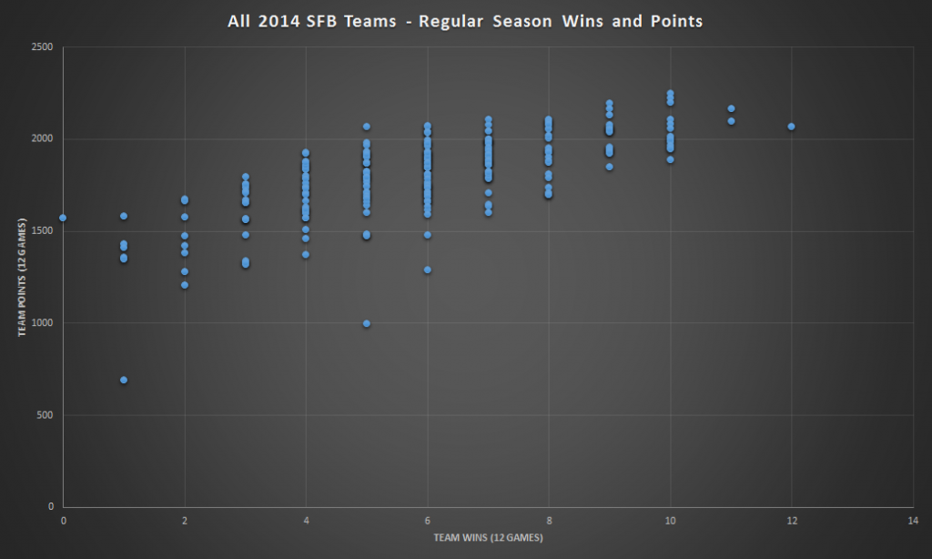 Last year, the league had 240 teams, and I went back to see how those teams did and what it took to create a winning team. The first chart shows all 240 teams, graphed by their regular season point totals (y-axis) and regular season wins (x-axis). It was a 12-game regular season.
