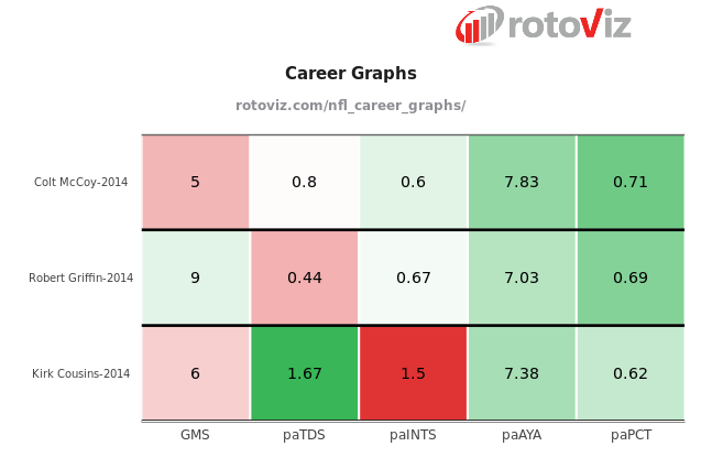 As for statistics, the RotoViz Career Graphs app shows that RG3 couldn’t keep up with either of the backup quarterbacks in efficiency last season: