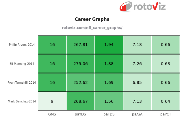 Sanchez is now going into his second year in the Philadelphia system, and he brings a year of experience to the role. Other quarterbacks going into their second year of an offense — Philip Rivers, Eli Manning, and Ryan Tannehill — are highly drafted because fantasy drafters expect progress, and Sanchez compares reasonably well to each, as shown by the RotoViz Career Graphs app: