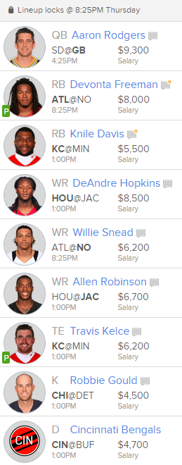 Well it didn’t take long for Antonio Gates to make an impact after his dominant return on Monday Night Football. Gates stole the show under the bright lights of MNF for the Chargers posting a monster line of 9/92/2. I’ve seen all I need to see and despite the tough matchup this week versus the Packers, I’m playing Gates in a ton of lineups. Gates is a matchup nightmare and not one that will be easy to contain for the Packers. Gates dominated targets on Monday night with 11 and I’m expecting Rivers to lean heavily on him again on the short week. Gates is fresh and a good bet to reach pay dirt again this week. He’s a nice bargain at his current FanDuel salary of $5500.