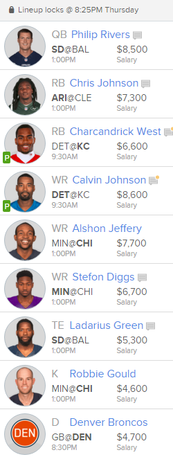 This week West gets to face a Detroit Lions defense that has struggled to defend the run. They’ve allowed the sixth-most rushing yards (864) and are tied with the Falcons with the most rushing touchdowns allowed (10). While the game script could get out of hand the Chiefs should have Jeremy Maclin back, which is why I’m optimistic they’ll be able to stay in this game. Given this week’s FanDuel pricing at the running back position, I’m perfectly fine fading higher priced options and rolling out tournament lineups with guys like West, McFadden, and Danny Woodhead.
