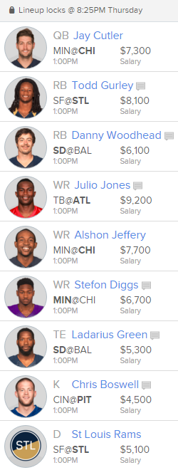 The St. Louis Rams were a great DFS play last week scoring 25 points on FanDuel. I really like them again this week at home versus the San Francisco 49ers. Carlos Hyde is banged up and isn’t the same guy we saw back in Week 1 rumble for 168 yards against the Vikings. Colin Kaepernick is a matchup based quarterback and this is NOT a good matchup for him. The Rams have the defensive front to put some pressure on Kaepernick and force him into some bad decisions, resulting in turnovers. The Rams have allowed an NFL-fewest five passing scores which ties them with the Carolina Panthers and Denver Broncos. Let’s not forget they always have the threat of a special teams touchdown with track star Tavon Austin returning kicks.