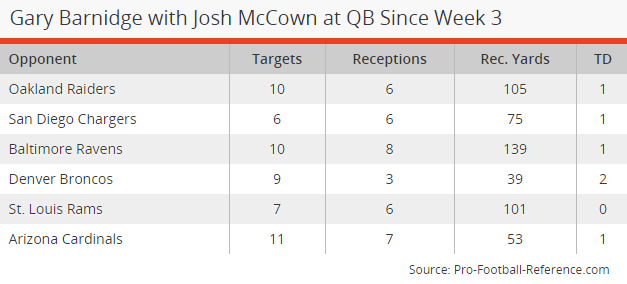 Gary Barnidge has been the most surprising breakout tight end this year outside of Travis Eifert. It must be something in the water in Ohio but whatever it is he’s for real. Barnidge really seemed to take off with Josh McCown under center earlier in the season compared to Johnny Manziel. With breaking news that Josh McCown is taking back over the reins of the Browns offense that has to be music to Barnidge’s ears. I like to let the numbers speak for themselves so here is some data from Pro-Football-Reference.com to backup this claim.