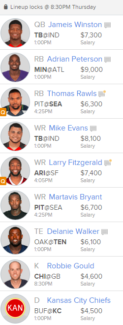 The arrow is pointing up for the team that calls Arrowhead Stadium its home. Speaking of Arrowhead Stadium, its one of the toughest places to play on the road and the Bills will find that out Sunday. Tyrod Taylor is banged up with an AC joint sprain which will limit his effectiveness on deep throws, thus decreasing the chances of Sammy Watkins making a long catch. Taylor is going to struggle to make accurate throws which could lead to a couple picks in this contest. If Marcus Peters gets his paws on the ball I like his chances of bringing it back for a pick-six. The Chiefs will be in the majority of my cash and GPP lineups since they’re hands down the best value defense on FanDuel at $4500.