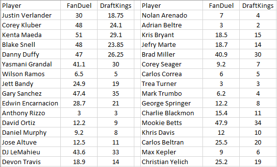 Fernandez is the highest priced pitcher on both sites, so it’ll be a challenge to fit him in with many high-priced hitters to choose from. This game has the lowest game total at seven, and with the Mets starting Rafael Montero, the runs should be coming from the Marlins’ bats. This season, the Mets are striking out 22.0% of the time, which is seventh most in MLB. Strikeouts are what you want and Fernandez delivers with 12.89 K/9, which is the highest in MLB, and second highest in strikeouts after Max Scherzer.