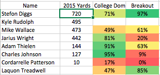 If you’ve read my past articles you’ll know how important college dominator and breakout age are to a wide receiver’s chances at NFL success. 63% of the WRs to finish in the top 24 over the last 7 years had an above-average college dominator AND breakout age. Here is what the 2015-2016 Vikings WR group looked like.