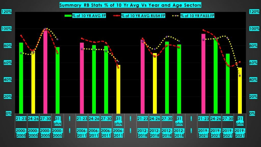 This figure shown above from my upcoming lesson on RB Metrics was discussed on our podcast. It is a snapshot of RBs from 2000 to 2021 by years, RB age groupings with rushing and reception-based fantasy points.